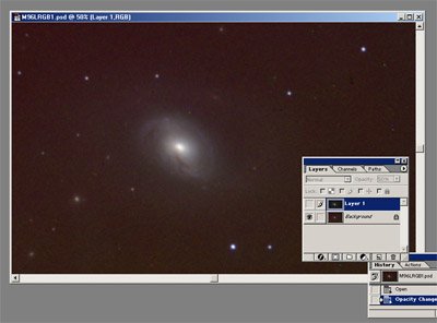 Mint az, az (1) képen is látható az erdeti RGB kompozit alacson Jel/Zaj viszonnyal rendelkezik. Amikor a fényesség réteg átlátszóságát felhozzuk 100%-ra (2. kép) a színek elmosódnak és eltompulnak. A 3. képen az átlátszóság 50%-os, a rétegek össze vannak olvasztva, és némi szaturációt és Gauss elmosást végeztünk vele. Az eredmény egy új RGB kompozit gazdagabb színekkel és tökéletesebb felbontással. Aztán az új tökéletesebb RGB komponenst használjuk a végső LRGB kompozit elkészítéséhez. (4. kép)