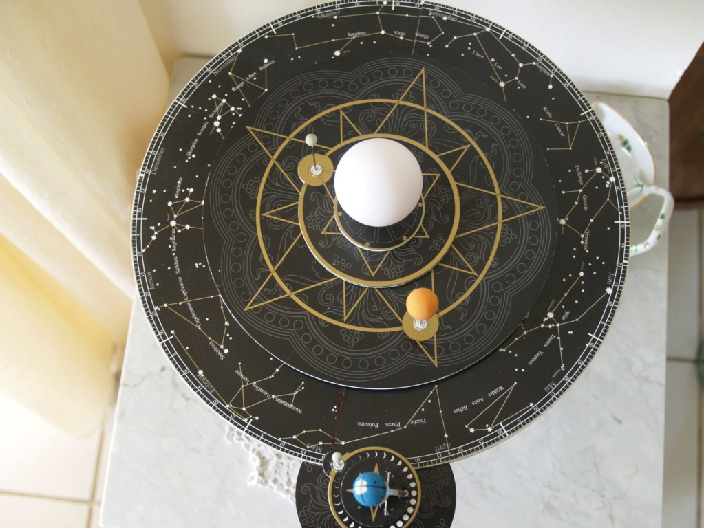 Egyik lelkes tagtársunk Vilmos Mihály készítette a képeken látható mozgó planetáriumot. A planetárium 18db A4-es karton papírból vágható ki kb. 1000 db alkotó részt kellet összeragasztani. Mindenképp türelmet és kitartást igénylő munka, de a végeredmény megéri a fáradtságot.