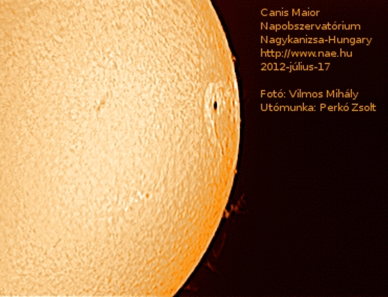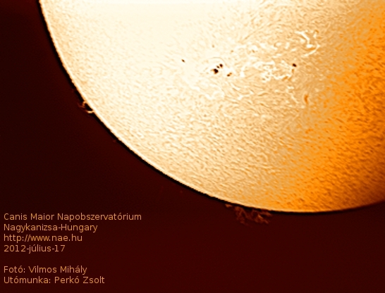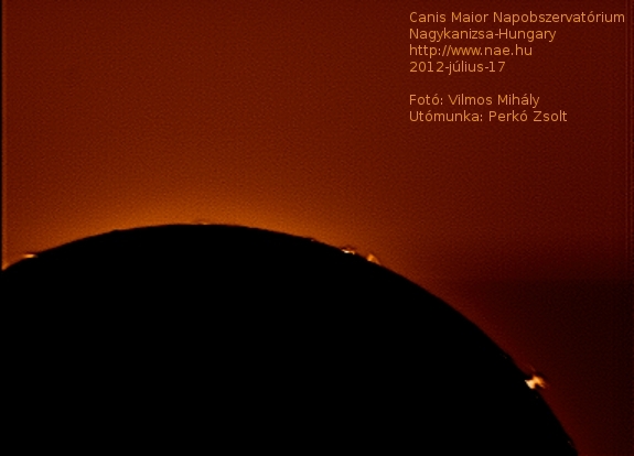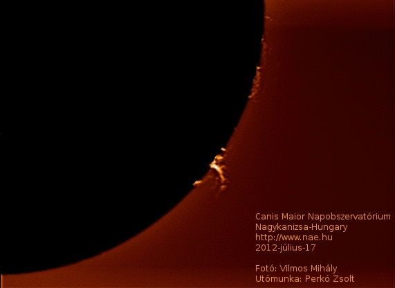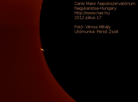 Egy kis késéssel, de feldolgozásra kerültek a június 19-én ill. július 10-17 időszakban készült felvételek, melyeket Vilmos Mihály készített, az utófeldolgozást pedig Perkó Zsolt csinált. A felvételeken a napfelszíni jelenségek, protuberanciák, filamentek, napfoltok láthatók a fény H-alfa hullámhosszán. A felvételekhez a Canis Maior Napobszervatórium módosított Coronado PST naptávcsövét és egy monokróm biztonsági kamerát használtuk fel. A felvételek összegzését a Registax 5.1 programmal végeztük, majd a Gimp 2.6-al mesterségesen szineztük ki a képeket.