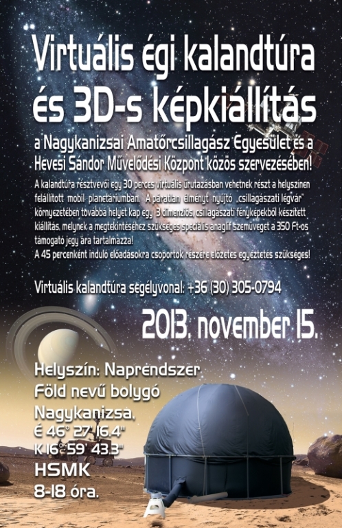 Virtuális égi kalandtúraés 3D-s képkiállítás a Nagykanizsai Amatőrcsillagász Egyesület és a Hevesi Sándor Művelődési Központ közös szervezésében!