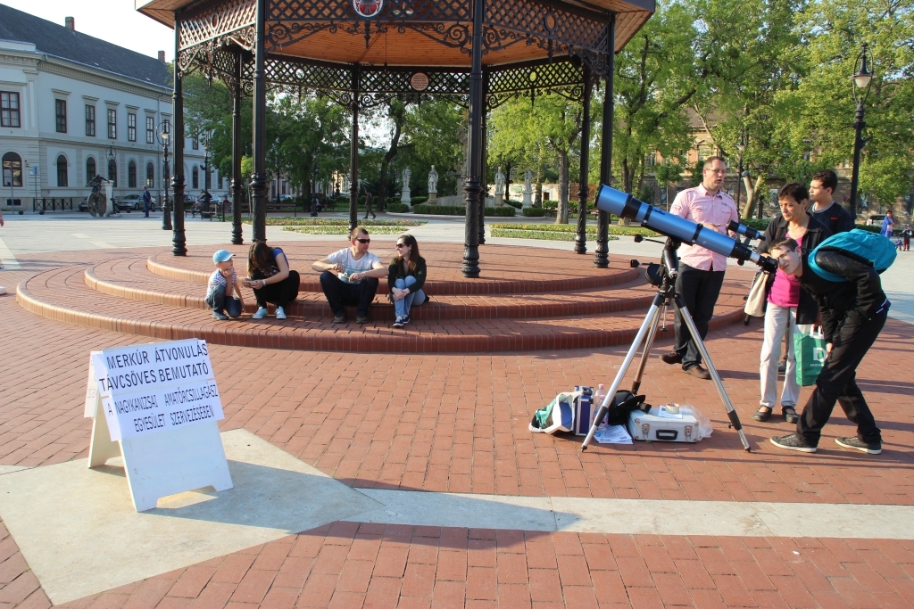 Az Erzsébet téren is sokan vártak bennünket, hogy megtekintsék a jelenséget. Nagyon sok iskolás is volt köztük. Szerencsére most nem alakult ki pánikhangulat, és nem zárták be a gyerekeket a tantermekbe, nehogy megvakuljanak, mint tették ezt a 2015. március 20-i részleges napfogyatkozás alkalmával. Pedig most sokkal kevesebbet takart ki a Merkúr a napkorongból, mint tavaly a Hold.