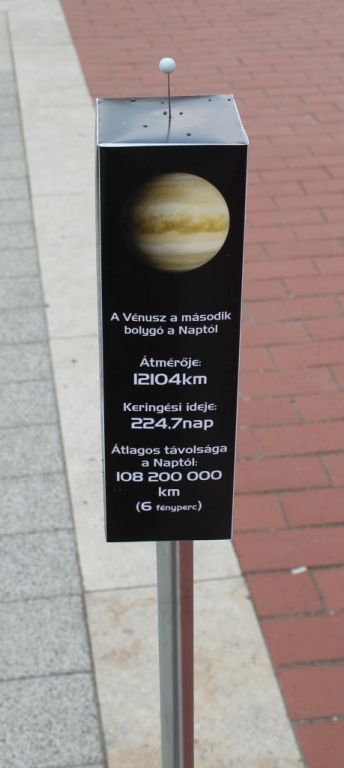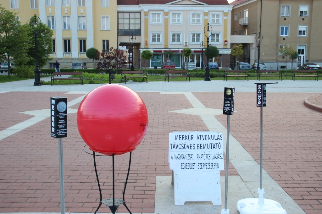 Felállítottuk a távcsövünket és "üzembe helyeztük" az egyesület új szerzeményét egy Herschel-prizmát, aminek segítségével, biztonságosan megfigyelhető a Nap, a saját fényében. A téren felállításra került egy 1:1,850 milliárd méretarányú naprendszer modell is, melyet Gazdag Attila egyesületünk elnöke készített el. A Napot egy 75cm átmérőjű labda képviselte, a tőle 31,2 méterre keringő Merkúrt pedig egy 2.6 mm átmérőjű golyócska. Aztán őt követte a Vénusz (6.5mm) és Föld-Hold (6.8mm és 1.8mm) páros.