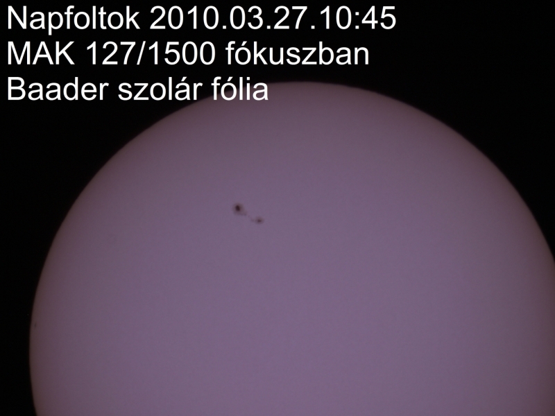2010 március 27-én készültek a felvételek agy MC 127/1500-as távcsővel Baader napszűrő fóliával, az újra aktivizálódott Napról.