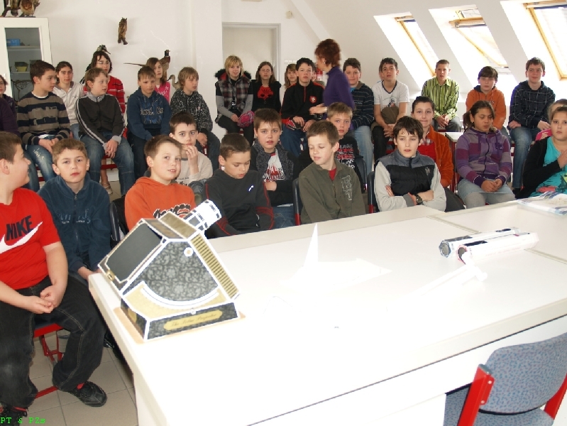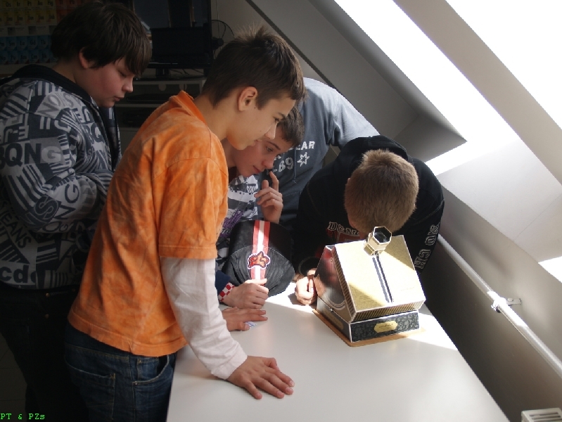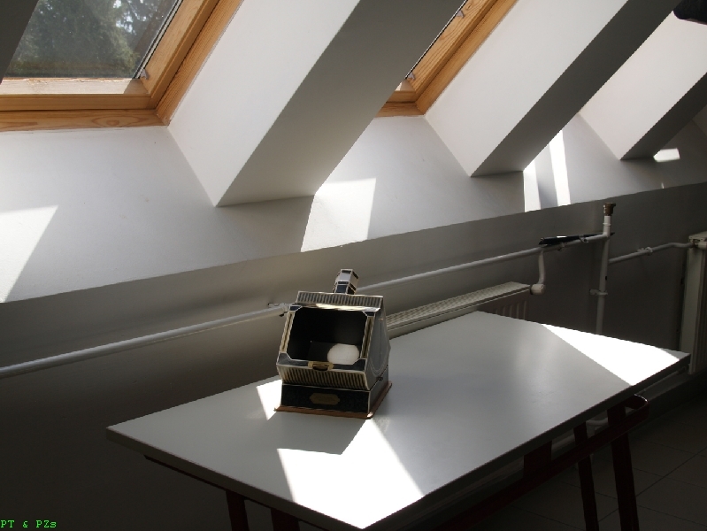 A tetőtér alatt egy klassz természettudományi "előadó" készült, remek felszereléssel, oda vonultunk 2-2- osztállyal. Kint percenként vonult felhő a Nap elé, és kiszámíthatatlan volt, hogy lehet e távcsövezni . Ezért beszélgetős előadást terveztem úgy, hogy ha a Nap picit is tovább süt, akkor az Astro-Media napprojektorával kivetített képet és a napfoltokat mégis fogják látni. Így is lett, volt amikor szóltam, hogy most ugrás a napvetítőhöz. Többen is odafértek, és látták a 7-8cm-es Napkorongot, előtte a vonuló felhőket, meg az álló foltokat a korongon. Aztán megint nagy felhő, és én folytattam, ahol abbahagytam, az ókori csillagászattól kezdve Galilei Jupiter-holdjaiig.